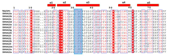 Alignment of TB2/DP1/HVA22 domains of SlHVA22 proteins with that of the typical human TB2/DP1. The secondary structural elements determined by the ESPript 3.0 web tool are indicated above the alignment. The putative conserved casein kinase II sites in the α-helix of the TB2/DP1/HVA22 domain are marked by a blue box.