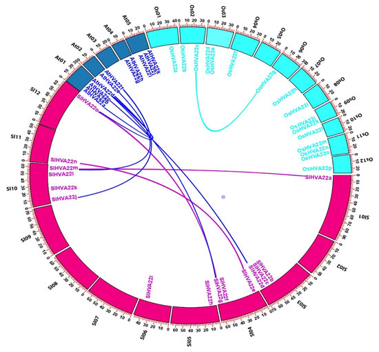 Microsyntenic relationship of HVA22 genes across Arabidopsis, tomato, and rice. The chromosomes of the three species are depicted by different colors: Arabidopsis, blue; tomato, pink-red; and rice, aqua. All chromosomes are illustrated with the scale in megabase pairs (Mbp). The duplicated SlHVA22 genes in tomato genomes are linked by pink-red lines.