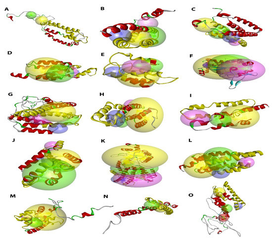 Predicted three-dimensional homology structure of tomato HVA22 proteins. The final 3D structures of SlHVA22 proteins were built by Discovery Studio v.21.1. The secondary structural components: α-helices (red), β-sheets (cyan), coils (green), and loops (gray) as well as the top four putative binding sites: site 1 (yellow sphere), site 2 (green sphere), site 3 (red sphere), and site 4 (blue sphere) are indicated in the predicted 3D models of (A) SlHVA22a; (B) SlHVA22b; (C) SlHVA22c; (D) SlHVA22d; (E) SlHVA22e; (F) SlHVA22f; (G) SlHVA22g; (H) SlHVA22h; (I) SlHVA22i; (J) SlHVA22j; (K) SlHVA22k; (L) SlHVA22l; (M) SlHVA22m; (N) SlHVA22n; and (O) SlHVA22o. The TB2/DP1/HVA22 domain portions in the generated models are underlined in yellow.