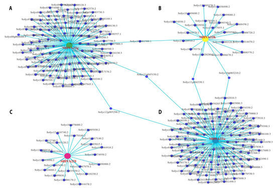 Weighted gene co-expression network analysis (WGCNA) of SlHVA22 genes. A–D: the co-expressed genes in the network of SHVA22g (A), SHVA22k (B), SlHVA22l(C), and SlHVA22a (D). The SlHVA22 genes are marked in red.
