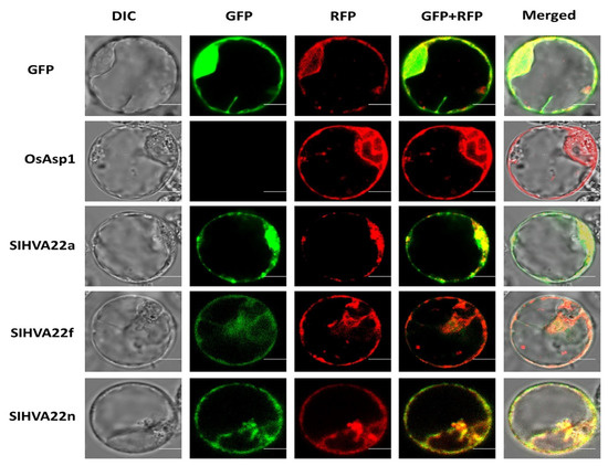 Sub-cellular localization of SlHVA22 proteins. SlHVA22s-SGFP fusion constructs were used to analyze the localization of SlHVA22a, SlHVA22f, and SlHVA22n, and the fluorescence signals were visualized with the confocal microscope. The OsAsp1-mRFP construct was utilized as an ER localization marker. Scale bars = 10 μm.