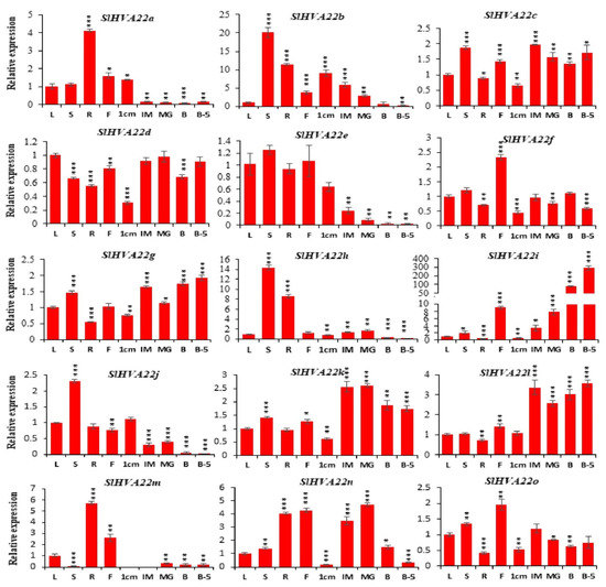 Expression profiles of SlHVA22 genes in various organs: leaves, roots, stems, flowers, 1 cm fruits, immature fruits (IM), mature green fruits (MG), breaker fruits (B), and fruits 5 days after the breaker stage (B5). The standard deviations of the means of three independent biological replicates are represented by the error bars. The different asterisks above the bars denote the significant variations between the control samples (leaves) and the samples harvested from the other organs, as analyzed by Student’s t-test with p-values less than 0.05 for *, 0.01 for **, and 0.001 for ***, respectively.