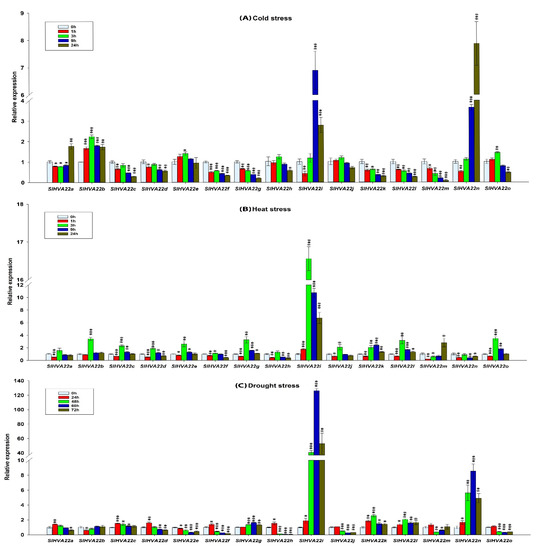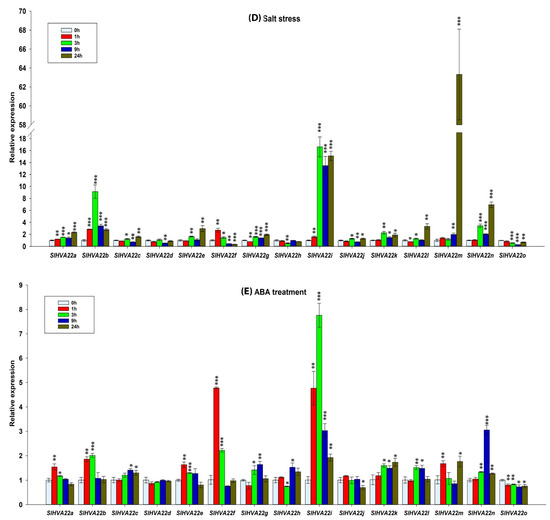 Salt treatment either markedly up or downregulated most SlHVA22 genes in comparison to the control, except for SlHVA22j, which was only minimally up- or downregulated (by ~1.3-fold). Eleven of the fifteen genes (SlHVA22a, SlHVA22b, SlHVA22c, SlHVA22e, SlHVA22f, SlHVA22g, SlHVA22i, SlHVA22k, SlHVA22l, SlHVA22m, and SlHVA22n) were significantly upregulated by 1.6- to 63-fold under cold stress in comparison with the control. Among the upregulated genes, the expression of SlHVA22m, SlHVA22i, SlHVA22b, SlHVA22n, and SlHVA22l was upregulated by 63-, 16-, 9-, 6-, and 3-fold compared with the control, respectively, under exposure to saline conditions. However, a few genes (SlHVA22h, SlHVA22j, and SlHVA22o) were downregulated by 1.8- to 3.3-fold under salt stress compared with the control (Figure 9D).