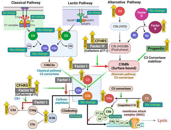 A schematic illustrating the initiating proteins of the classical, alternative and lectin complement cascades. Upward yellow arrows (labeled “PCOS”) indicate the proteins that were increased in women with PCOS. The green arrows in the illustration indicate the enzymatic activity or positive regulation, whereas the red arrows indicate the inhibition of pathways. Proteins that are not different in the PCOS cases are also indicated accordingly in the illustration. The illustration was created using BioRender.com (with publication license).