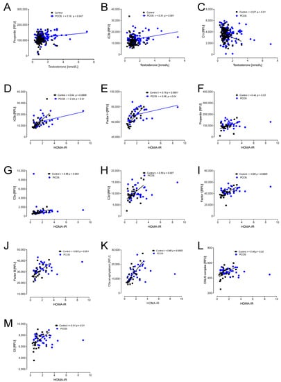 Correlations of complement pathway proteins with hyperandrogenemia (testosterone) and with insulin resistance (HOMA-IR) in patients with PCOS (n = 137) and controls (n = 97). Proteins that correlated, all positively, with testosterone were properdin (A), iC3b (B) and C1r (C). Proteins that correlated, all positively, with HOMA-IR were iC3b (D), factor H (E), properdin (F), C3a (G), C3d (H), factor I (I), factor B (J), C5a (K), C5b,6 complex (L) and C5 (M). RFU—relative fluorescent units.