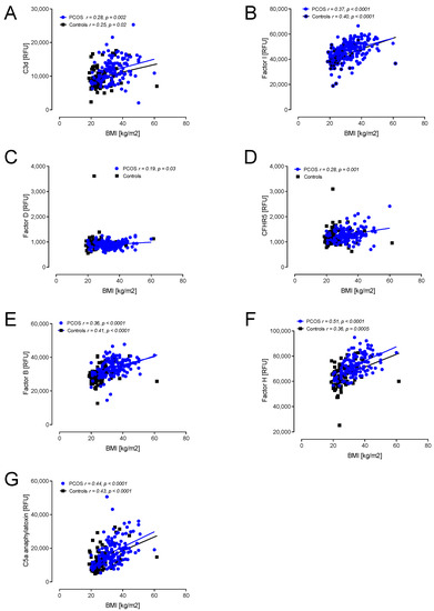 Correlations of complement pathway proteins with body mass index (BMI) in patients with PCOS (n = 137) and controls (n = 97). Proteins that correlated, all positively, with BMI were C3d (A), factor I (B), factor D (C), CFHR5 (D), factor B (E), factor H (F) and C5a (G). RFU—relative fluorescent units.