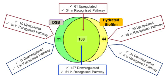 This Venn diagram represents identified proteins dysregulated >2-fold, p < 0.05 in comparison with 24 h planktonic culture. It shows the dispersion of common proteins (188) between hydrated and DSB as well as uniquely identified proteins based on abundance ratios in the hydrated biofilm (44) and DSB (21). Pathway analysis was performed using KEGG.