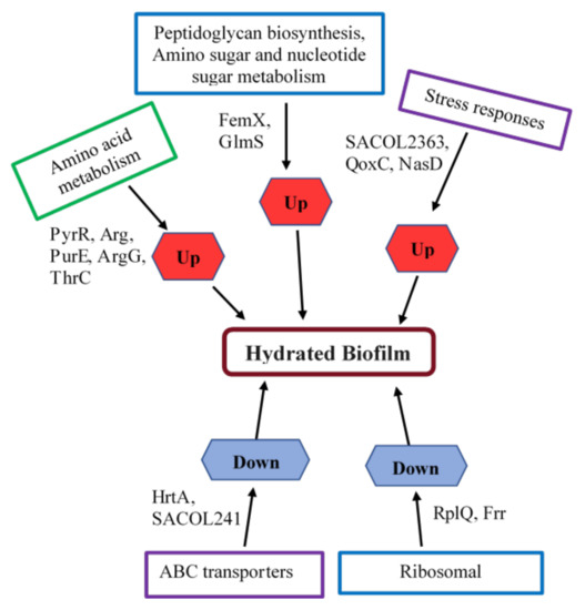Of these proteins, glucosamine-fructose-6-phosphate aminotransferase (GlmS), and argininosuccinate synthase (ArgG) are cytoplasmic enzymes involved in alanine, aspartate and glutamate pathway. Galactose-6-phosphate isomerase (LacA) is a part of galactose metabolism pathway. These proteins are responsible for energy metabolism and are the vital points to support regular cell development and replication processes for biofilms [28,29,30]. In Figure 2, we have demonstrated potential regulators of S. aureus biofilm formation in the hydrated biofilm identified from TMT-based analysis.