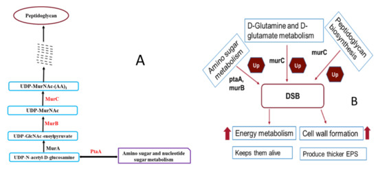 Of these, phosphotransferase system (PTS) glucose transporter subunit IIBC (PtaA) is significantly upregulated in DSB, suggesting that sugar uptake and PIA-mediated biofilm matrix deposition became active in DSB through PTS. Multiple proteomics analysis has demonstrated an increased abundance of PTS system-associated proteins under various biofilm growth stages and stress-associated conditions in several Gram-positive organisms including S. aureus [34,35,36]. Additionally, PtaA is also involved in amino sugar and nucleotide sugar metabolism and is responsible for energy metabolism and linked with peptidoglycan biosynthesis pathway. In particular, UDP-N-acetylmuramate-L-alanine ligase (MurC) and UDP-N-acetylenolpyruvoylglucosamine reductase (MurB) are cytoplasmic enzymes involved in the peptidoglycan biosynthesis pathway, which is essential for cell-wall formation and may play a role in biofilm formation. Cell-wall synthesis involves the construction of peptidoglycan monomers (polymeric mesh) from precursors UDP-N-acetylglucosamine and UDP-N-acetylmuramate [33].