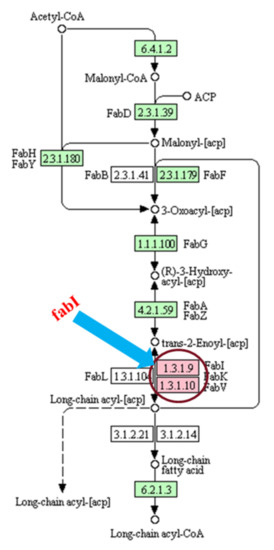 A cytoplasmic membrane enzyme enoyl-ACP reductase (FabI) is a vital enzyme, involved in fatty acid biosynthesis and metabolism and was significantly upregulated in DSB. Enoyl-ACP reductase plays an essential role in the finishing cycles of the chain elongation process in the essential fatty acid biosynthesis pathway and is vital for cell survival (Figure 4) [41].