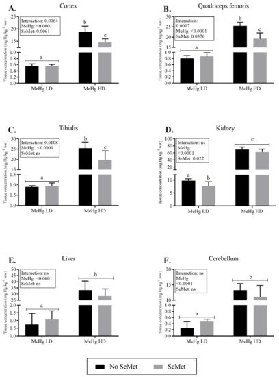 Figure 1. Total Hg concentration (mg Hg kg−1 ww) in cortex (A), quadriceps femoris (B), tibialis (C), kidney (D), liver (E) and cerebellum (F) of adolescent BALB/c mice exposed to dietary MeHg (0.28 and 5 mg Hg kg−1 feed) with or without supplementary SeMet for 11 weeks. All results are presented as means with 95% CI (n = 6). The box in each graph denotes p-values from two-way ANOVA analysis showing MeHg (main effect), SeMet (main effect) and interaction effect between MeHg and SeMet. Different lowercase letters represent statistical significance (p < 0.05) between the groups analyzed with the post hoc test Tukey’s multiple comparisons test. Statistics are based on log transformed (log10) data (AD) and robust statistics (E,F) while figures present raw data. The bars representing mercury levels in cortex (A) have been presented previously for the groups MeHg LD and MeHg HD [41] but are still presented here for comparative purposes between the mercury levels in mice with and without the supplementary SeMet in the diet. Abbreviations: MeHg, methylmercury; SeMet, selenomethionine; LD, low dose; HD, high dose; ns, not significant.