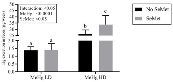 Reduced accumulation of mercury has previously been shown to occur following selenium exposure in experiments using zebrafish [29], seabream [42], mice [43,44] and rats [45,46]. Due to the high affinity of MeHg to selenium [47], the Se-Hg complex will form in the intestine and subsequently reduce the absorption and increase fecal excretion of mercury. In the present study a statistically significant increase of mercury in feces of SeMet- and MeHg-exposed mice was observed for the high dose. This is in line with several previous studies which have reported increased excretion of mercury after selenium supplementation [29,48,49,50,51]. Moreover, selenium may contribute to MeHg demethylation in the intestines whereby uptake of MeHg in the body is reduced and the percentage of the less bioavailable inorganic mercury is increased [42,46,52]. Also, redistribution of mercury by selenium to less critical target organs has been a proposed mechanism of the protective Se-effect [53,54], e.g., redistribution to fur, a compartment prone to high mercury levels [55,56].