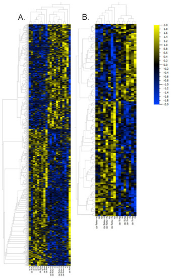 Figure 3. Heatmaps and hierarchical clustering analysis (HCA) displaying significant MeHg HD-SeMet interaction effect in 916 RNA transcripts (p < 0.05) (A) and in 149 proteins (p < 0.05) (B) (ANOVA, hierarchical clustering, Pearson correlation).