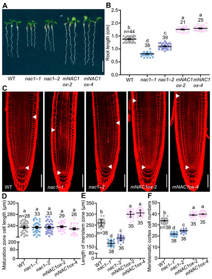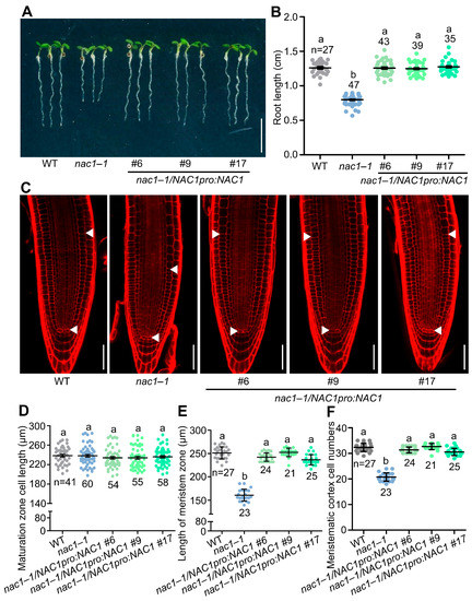 Compared to wild-type plants, both nac1 mutants and nac1–1/nac1–2 F1 generation mutants had shorter roots, whereas the mNAC1 overexpression lines displayed longer roots (Figure 1A,B and Figure S1A,B). Similarly, the size of the root apical meristem and meristem cell number were reduced in the nac1, nac1–1/nac1–2 F1 generation mutants and increased in the mNAC1 overexpressing lines, whereas the cortical cell length in the root maturation zone was unaltered compared to the wild type (Figure 1C–F and Figure S1C–F). Likewise, root length, root apical meristem size, and meristem cell number were completely or largely restored in nac1–1/NAC1pro:NAC1 compared to nac1–1 (Figure 2A–F), confirming that these phenotypes were caused by a mutation in NAC1.