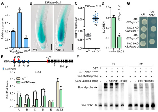 Considering the essential role of the E2Fa gene in controlling cell division and differentiation during the G1/S cell cycle [17,24,34], we first examined the expression of E2Fa by RT-qPCR since meristem cell numbers were decreased in the nac1 mutant (Figure 3A). We observed a higher transcript level of E2Fa in nac1–1, and a decrease in mNAC1ox-4 overexpression lines compared to wild type (Figure 3A). Consistently, the expression of E2Fapro:GUS, which is highly expressed in the meristem of wild-type roots, was dramatically accumulated in nac1–1 roots (Figure 3B,C). Furthermore, to examine whether the NAC1 affects the transcriptional activity of E2Fa in plants, we then used a transient transformation LUC reporter gene (E2Fapro:LUC) and performed transient expression assays in Arabidopsis leaf mesophyll protoplasts. The results showed that the LUC expression of the E2Fa promoter was specifically repressed by NAC1 compared with control (Figure 3D). Taken together, these results suggest that NAC1 inhibits the transcriptional activity of E2Fa.