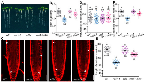 E2Fa acts downstream of NAC1 to control root growth. (A) The root growth phenotypes of WT, nac1–1, e2fa, and nac1–1/e2fa grown on 1/2 MS medium. The seedlings were photographed at 5 dpg. Scale bar represents 0.5 cm. (B) Measurements of primary root length of WT, nac1–1, e2fa, and nac1–1/e2fa as shown in (A). (C) Confocal images of root tips of WT, nac1–1, e2fa, and nac1–1/e2fa as shown in (A). The seedlings were used at 5 dpg for imaging. White arrows indicate the boundary between root meristem and transition zones. White arrows below indicate the QC. Scale bars represent 50 μm. (D) Root cortical cell length in the maturation zone of 5 dpg seedlings as shown in (C). (E) Length of meristem zone of 5 dpg seedlings as shown in (C). (F) Cell numbers in the proliferation domain of 5 dpg seedlings as shown in (C). Data information: in (B,D–F), data represent mean ± SD, n denotes the total number of scored samples. Individual values (black dots) are shown. Different lowercase letters indicate significant differences by one-way ANOVA followed by Tukey’s multiple comparison test (p < 0.05).