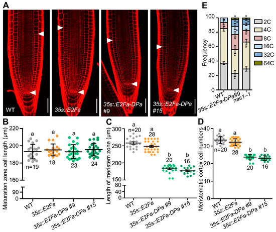 Overexpression E2Fa-Dpa complex affects root length by promoting endoreduplication. (A) Confocal images of root tips of WT, 35s::E2Fa, and two independent overexpression transgenic lines of E2Fa-DPa. The seedlings were used at 5 dpg for imaging. White arrows indicate the boundary between root meristem and transition zones. Scale bars represent 50 μm. (B) Root cortical cell length in the maturation zone of 5 dpg seedlings as shown in (A). (C) Length of meristem zone of 5 dpg seedlings as shown in (A). (D) Cell numbers in the proliferation domain of 5 dpg seedlings as shown in (A). (E) Distribution of nuclear ploidy in the root meristem cells of WT, 35s::E2Fa-DPa #9, and nac1–1, using flow cytometry at 4 dpg. Two independent experiments were performed, and representative results are presented (Student’s t test, * p < 0.05). Data information: in (B–D), data represent mean ± SD, n denotes the total number of scored samples. Individual values (black dots) are shown. Different lowercase letters indicate significant differences by one-way ANOVA followed by Tukey’s multiple comparison test (p < 0.05).