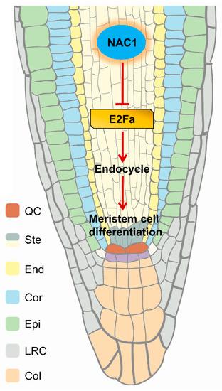 In Petunia, the NAC family gene NAM was expressed at the primordial and meristem boundaries, and the mutants failed to develop apical shoots [37]; Arabidopsis cuc1 cuc2 double mutants displayed highly affected shoot apical meristem development and also exhibited fused cotyledons, sepals, and stamens [38,39]. In contrast to the other members of the NAC family, whose expression is restricted to shoot meristem and flower (NAM, CUC2, NAP) or to vascular tissues (such as, CmNACP), as a member of NAC family, NAC1 is highly expressed in roots, and especially, the highest NAC1 expression is restricted to lateral root initiation regions and the root tip (meristem and elongation zone) [32]. Previously data identify NAC1 as a transcription activator in the auxin signaling pathway that regulates genes encoding molecules involved in the specification of lateral root formation [32]. During de novo root organogenesis in Arabidopsis, the NAC1 pathway functioned independently of auxin-mediated explant-specific wounding and root tip emergence [33]. However, the mechanism by which NAC1 regulates root meristem and root growth is unknown. Here, we provide evidence to show that NAC1 maintains root meristem and root growth through directly repressing E2Fa transcription, and loss of NAC1 triggers up-regulation of the E2Fa gene expression, which affects root meristem cell division through the regulation of the endocycle (Figure 6).