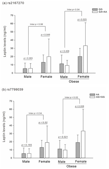 - Duan, D.M.; Jhang, J.Y.; Wu, S.; Teng, M.S.; Hsu, L.A.; Ko, Y.L. Modification effect of sex and obesity on the correlation of LEP polymorphisms with leptin levels in Taiwanese obese women. Mol. Genet. Genomic. Med. 2020, 8, e1113. [Google Scholar] [CrossRef]