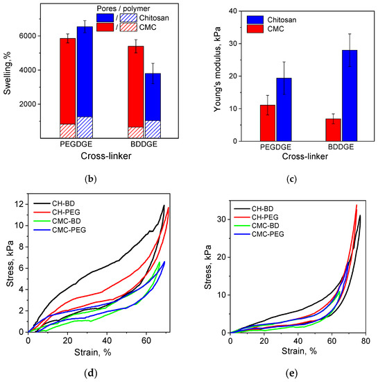 Characteristics of CMC- and chitosan (CH)-based cryogels cross-linked with 1,4-butanediol diglycidyl ether (CH-BD and CMC-BD) and poly(ethylene glycol) diglycidyl ether (CH-PEG and CMC-PEG): Confocal laser scanning microscopy (CLSM) images and average pore sizes, scale bar—100 µm (a); swelling (b), Young′s moduli (c) and strain–stress curves measured in the air (d) and in contact with water (e).