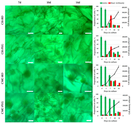 The cells seeded into cryogels (3D conditions) passed a short-term lag phase, but had already begun to form distinct spheroids by the third day (Figure 2 and Figure S5, Supplementary Materials). At this phase, 80–90% of all cells were active. By the 7th day, the differences in cell activity and viability between CH and CMC cryogels became noticeable; the proportion of active cells decreased abruptly to 20–30% in chitosan cryogels, while in CMC cryogels it was 50–80%. It is noteworthy that a slightly higher (by 5–10%) proportion of active cells was observed in cryogels cross-linked with PEGDGE, which had higher elasticity, swelling capacity and, in case of CMC, larger pore size. Further cultivation resulted in a gradual decrease of active cells to 5–20%, but the proportion of dead cells did not exceed 20% by the 14th day, with the total cell density continuing to grow, reaching 200–300 × 103 cells/cm2 in chitosan cryogels and 300–400 × 103 cells/cm2 in CMC cryogels (Figure 2).
