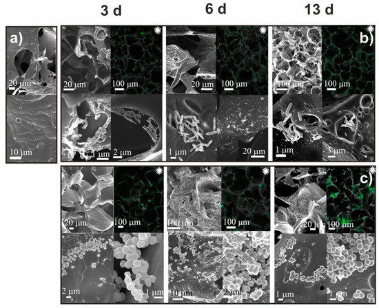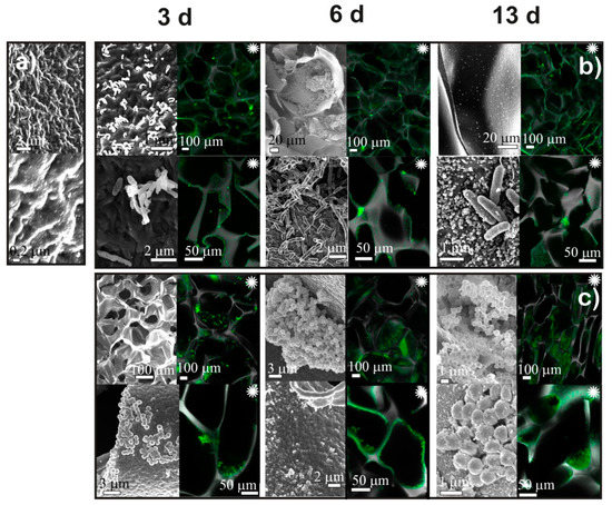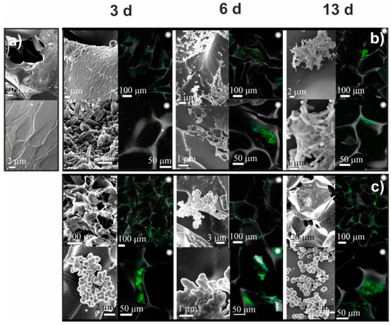 The results of SEM and CLSM observations of CH-BD cryogel before (a) and after cultivation for 3, 6, and 13 days Pseudomonas fluorescens (b) and Staphylococcus aureus (c). Black and white images—SEM, colored images marked with asterisk (∗)—CLSM.