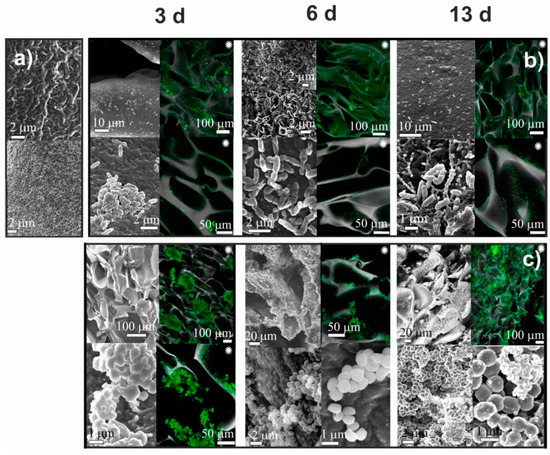 The results of SEM observation of CH-PEG cryogel before (a) and after cultivation for 3, 6, and 13 days Pseudomonas fluorescens (b) and Staphylococcus aureus (c). Black and white images—SEM, colored images marked with asterisk (∗)—CLSM.