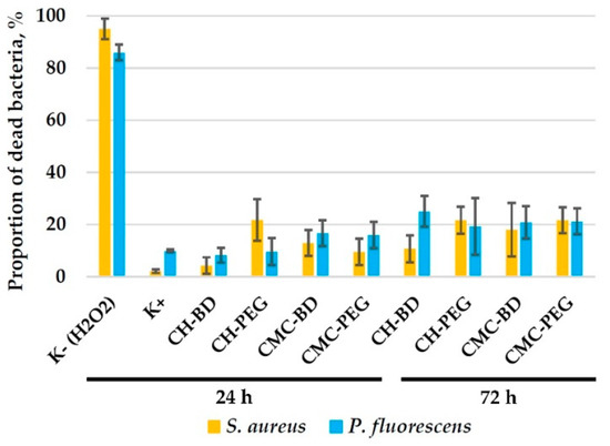 The proportion of dead bacteria in the control (culturing in CO2-incubator in adhesive plates without shaking) reached 5–10% after 24 h (Figure 7). About 85–95% of bacteria died after the incubation with 10 mM H2O2. When cultured in CMC and chitosan cryogels, the percentage of dead bacteria in suspension was 5–25%, with a slightly decreased viability after 72 h culturing compared to 24 h.