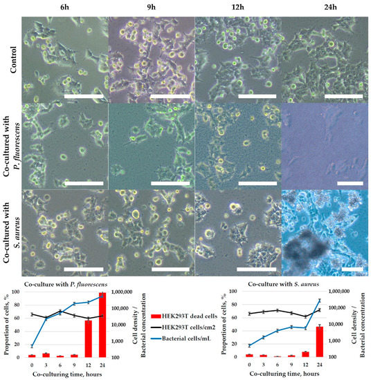 The results of co-culturing for 24 h are shown in Figure 8. S. aureus bacteria were characterized by slow growth during the first 12 h of co-cultivation from 500 to about 6000 bacteria/mL and a sharp logarithmic growth between 12 and 24 h to about 300 × 103 bacteria/mL. P. fluorescens showed rapid growth from 500 bacteria/mL at the moment it was inoculated into the co-culture to 550 × 103 bacteria/mL after 24 h. The presence of bacteria caused the inhibition of HEK-293T cell proliferation, however, a noticeable decrease in their density and changes in their morphology (HEK-293T cell detachment, greater spreading on the substrate, granulation of cell content, etc.) did not occur. After 12 h of co-cultivation, the toxic effect of two types of bacteria on HEK-293T cells was observed: the proportion of dead cells increased from 5–7% to 15–50%. P. fluorescens had a higher toxic effect, which is probably directly related to the higher growth dynamics of this bacterial species and the higher concentration of bacteria at the time of 12 h of co-cultivation, compared to S. aureus. After 24 h of co-cultivation with P. fluorescens, the viability of HEK-293T cells decreased to 2–5%. In the presence of S. aureus, the decrease of HEK-293T cells viability was much lower and reached 50% after 24 h of co-culturing.