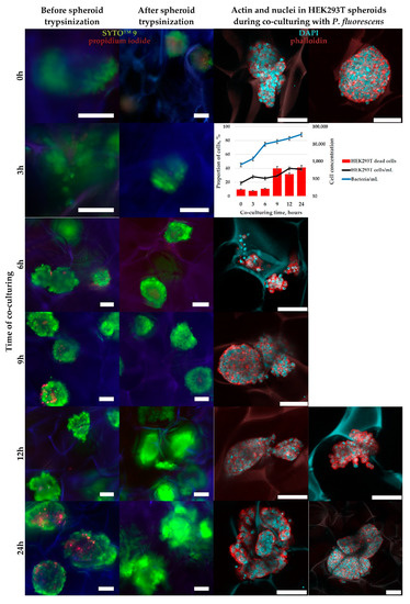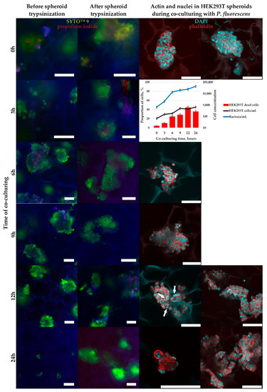 Although S. aureus had higher affinity to the cryogels surface, to co-culture HEK-293T cells and bacteria in 3D we have chosen P. fluorescens, as its presence induced higher damage for human cells in 2D culture. To obtain more contrast and reliable results for a short period of co-culturing, we decided to inoculate P. fluorescens to HEK-293T spheroids in CMC cryogels, in which cells had the higher activity and viability by the 10th day of cultivation in comparison with cultivation in chitosan-based cryogels. Additionally, CMC cryogels, as low adhesive substrates for bacteria, are more suitable for long-term experiments and can be used as flow-type alternative to the mammalian cell-bacteria co-culturing models in the wells with separating membrane.