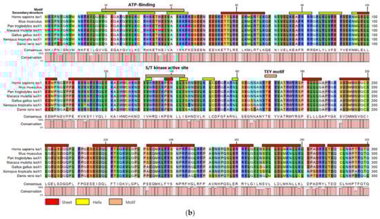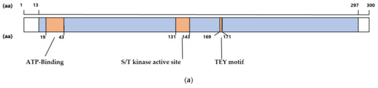 We compared the relationship between amino acid conservations and functional prediction concerning Figure 2. Among various species, the amino acid conservations in critical sites are 98.3% in ATP-binding site, 100% in S/T kinase active site and TEY motif, with 96.3% and 92.3% in the non-critical sites in the catalytic region (amino acids; aa No. 144–168, No. 257–297), respectively.