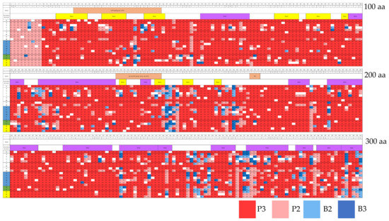 Heatmap of integrated in silico prediction data from PolyPhen-2 (HumDiv), PolyPhen-2 (HumVar), and PROVEAN analysis. The criteria for judgment were indicated in Table 2. There were 94.0% pathogenic mutations and 6.0% benign mutations out of 5700 mutations. Amino acid sequences are shown at the top of the table, where amino acids were divided into non-polar and polar amino acids, polar amino acids, those without acidity (blue), as well as acidic amino acids (green), and basic amino acids (yellow). Wild-type (WT) amino acids such as M1M, K2K, I3I, … were indicated “.” And colored in white. The mutation judgments P3, P2, B2, and B3 are shown in the smallest square. aa; amino acids.