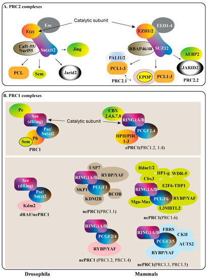 PcG proteins assemble into two types of Polycomb Repressive Complex (PRC), which are highly modular and have mutually reinforcing interactions. PRC1 is an E3 ubiquitin ligase that serves to mono-ubiquitinate histone H2A in Drosophila and humans at lysine 118 and 119, respectively [9,10,11]. PRC2 acts as a methyltransferase that variably mono-, di-, or tri-methylates histone H3 at lysine 27 (H3K27me1/2/3) [12,13,14,15]. The cores of both complexes exhibit a high degree of homology between Drosophila and mammals.