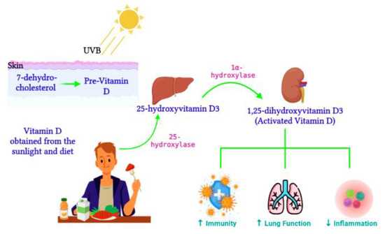Vitamin D metabolism. During sunlight exposure, UVB radiation converts 7-dehydrocholesterol to pre-vitamin D in the skin. Vitamin D acquired from the diet t is converted by 25-hydroxylase to 25-hydroxyvitamin D3 in the liver. Activated vitamin D, 1,25-dihydroxyvitamin D3, is then synthesized in the kidney. Activated vitamin D improves immunity and lung function and reduces inflammation (Image created on Biorender.com).