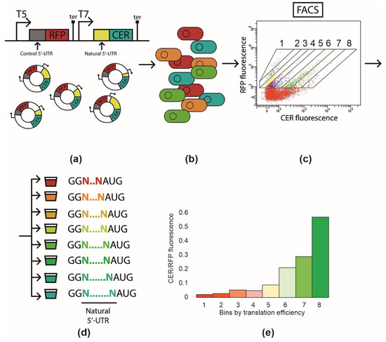 The principal scheme of the Flow-seq experiment. (a) Cloning of the DNA fragment containing natural 5′-UTR into pRFPCER reporter vector in front of cer gene while rfp gene retains its constant 5-UTR. (b) Transformation of the entire plasmid library into E. coli BL21 DE3 cells. (c) Fluorescence-activated cell sorting with CER/RFP fluorescence intensity ratio. Areas corresponding to fractions 1–8 are indicated. (d) Collection of cell fractions (1–8) according to CER/RFP fluorescence ratio. DNA extraction and amplification of 5′-UTR containing region followed by next-generation sequencing. (e) CER/RFP fluorescence ratio in the cells of fractions from 1 to 8 measured en masse with fluorimeter.