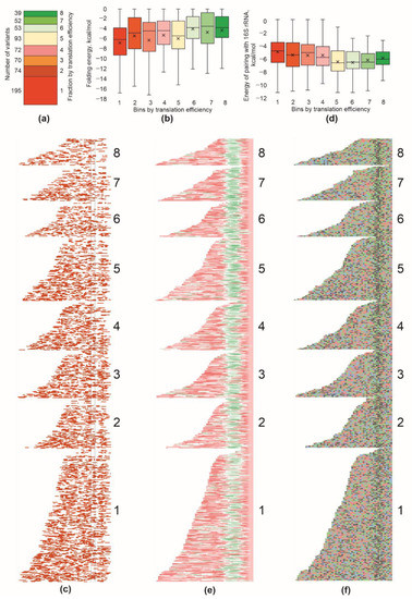 The best-known 5′-UTR element that determines translation efficiency is the Shine–Dalgarno sequence [14]. We analyzed a set of 5′-UTR regions composing our reporter set is search of the patches most likely to pair with the 3′-terminal part of 16S rRNA (Figure 2d,e). In agreement with the expectation, we found that 5′-UTRs possessing stronger SD pairings with the 16S rRNA (Figure 2d,e) drove, on average, a more efficient translation. No difference between the fractions in the location of the SD relative to the start codon was detected (Figure 2e).