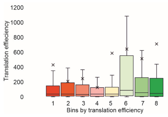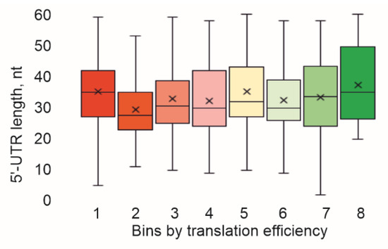 Additionally, we checked how the 5′-UTR lengths were distributed among the bins separated using translation efficiency (Figure 3). It appeared that the 5′-UTR length distribution was approximately the same for mRNAs with different translation efficiencies.