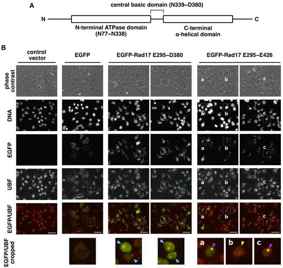 Chicago/Turabian StyleFukumoto, Yasunori, Masayoshi Ikeuchi, Yuji Nakayama, and Yasumitsu Ogra. 2022. "Rad17 Translocates to Nucleolus upon UV Irradiation through Nucleolar Localization Signal in the Central Basic Domain" International Journal of Molecular Sciences 23, no. 20: 12300. https://doi.org/10.3390/ijms232012300