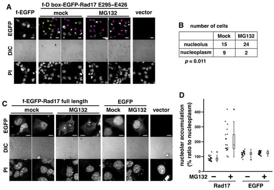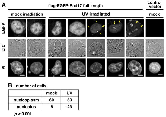 APA StyleFukumoto, Y., Ikeuchi, M., Nakayama, Y., & Ogra, Y. (2022). Rad17 Translocates to Nucleolus upon UV Irradiation through Nucleolar Localization Signal in the Central Basic Domain. International Journal of Molecular Sciences, 23(20), 12300. https://doi.org/10.3390/ijms232012300