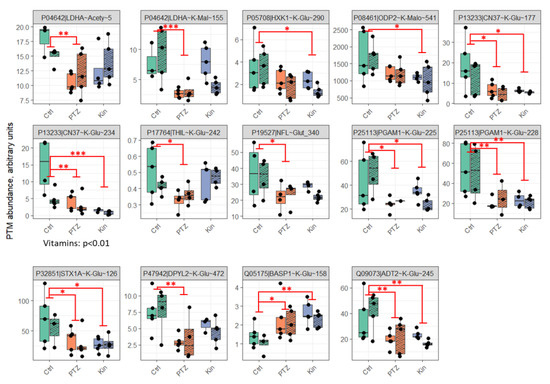 Acylations of the rat brain cortex proteins, found to change significantly after PTZ-induced seizures. Shading denotes administration of vitamins. In all the presented cases, the factor of PTZ treatment is significant (p ≤ 0.05) according to two-way ANOVA, while the factor of vitamins administration is not, except for P13233|CN37~K-Glu~234 (indicated below the graph). *, ** and *** signify p ≤ 0.05, p ≤ 0.01 and p ≤ 0.001 for comparisons of single PTZ-induced seizure (PTZ), seizure upon pharmacological kindling with PTZ (Kin) and the control animals (Ctrl) according to post hoc Tukey test. The level of acylation in each of the presented animal group is quantified as described in Methods. Proteins and their modified residues are defined in the grey sections of the graphs. The UNIPROT IDs of the proteins are shown, with the panel order of the graphs according to increasing number of the identifiers. Acety—acetylation, Mal—malonylation, Glu—glutarylation. Each of the six studied groups comprised five animals. However, some data points are missing on the plots (not more than 2 per group of 10 control or exposed-to-PTZ animals) or excluded as outliers (not more than 3 per group of 10 control or exposed-to-PTZ). All sample sizes are given in Supplementary Table S3.