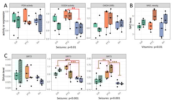 Effects of PTZ-induced seizures on acylation–deacylation regulators. (A) Activities of the brain pyruvate (PDH) and 2-oxoglutarate (OGDH) dehydrogenase complexes and protein expression of 2-oxoadipate dehydrogenase (OADH) measured by western blotting (WB). (B) NAD+ level in methanol-acetic extracts of the brain cortices. (C) Protein expression of brain sirtuin 2, 3 and 5 measured as described in Methods. ** and *** signify p ≤ 0.01 and p ≤ 0.001 according to post hoc Tukey test for the groups of the PTZ administration factor. Significant p values for the factors of PTZ treatment or vitamins administration are indicated below graphs. Each of the six studied groups comprised five animals. When fewer experimental points are shown on the plots, this is due to merged values and/or removed outliers (not more than 2 per group of 10 control or exposed to PTZ animals). All sample sizes are given in Supplementary Table S3.