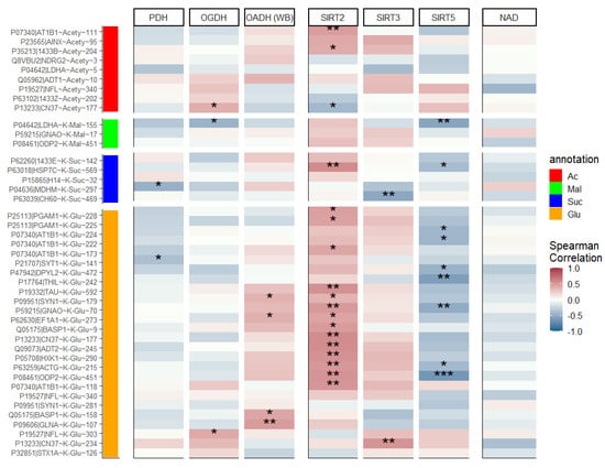 Spearman correlations of acylation levels of rat brain proteins with the activities of 2-oxoacid dehydrogenases PDH and OGDH, the protein expression of OADH measured by western blot (WB), the level of NAD+ and sirtuins 2, 3 and 5, measured as described in Methods. *, ** and *** signify p ≤ 0.05, p ≤ 0.01 and p ≤ 0.001 for Spearman rank correlations between each acylation site and biochemical parameter. Some correlation sample sizes deviate from the maximal number of studied animals (n = 30) because of missing data and/or outlier exclusion. All correlation sample sizes are given in Supplementary Table S3.