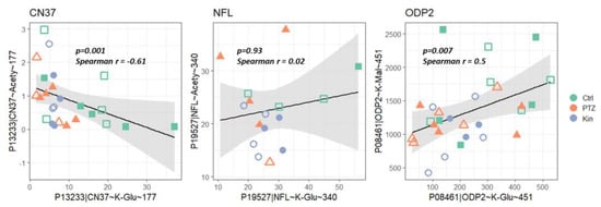 As protein sites modified by different acyl groups often overlap, potential competition between different acylation reactions for a single lysine residue is analyzed. Three such sites, identified in the studied rat brain homogenates, are shown in Figure 4. The existence of the competitive acylation reactions is confirmed by the negative correlation between the levels of the CN37 acetylation or glutarylation at K177 (Figure 4, CN37). However, in the case of K340 of neurofilament protein, no competition is observed between the residue acetylation or glutarylation (Figure 4, NFL). Finally, malonylation and glutarylation of K451 of ODP2 are positively correlated (Figure 4, ODP2). Thus, competitive acylation of a single protein site is not the only possible option, but the competition between the overlapping acylations may contribute to the complexity of the acylation regulation.