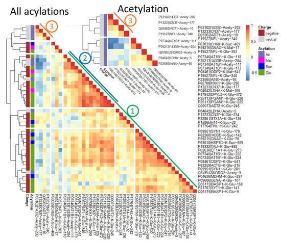 The correlation matrix of all acylations (Figure 5, All acylations) reveals a cluster of strong positive correlations between acylations regardless of the acylation type (cluster No. 1). However, this does not exclude negative correlations between other pairs of the acylated lysine residues (cluster No. 3). Even when we consider different sites of acetylation only, the levels of acetylation may show significant negative correlations (Figure 5, Acetylation). Thus, in the studied sample of animals, acetylation of some sites may either increase (positively correlated acetylations) or decrease (negatively correlated acetylation) along with acetylation of other sites. This heterogeneity excludes a view that all acylations of the brain proteins respond uniformly to some metabolic steady state characterized by an acetylation potential of the system.