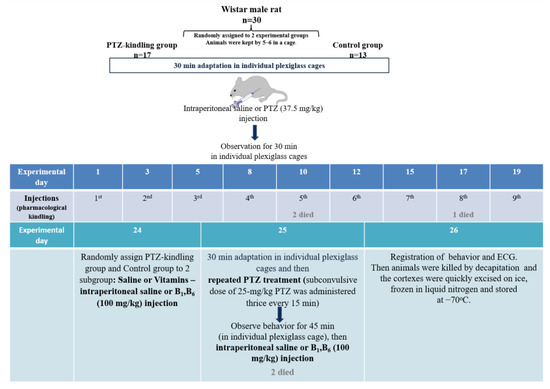 The flowchart of the kindling model of epilepsy. The pharmacological kindling was made during 9 days with the 37.5 mg/kg of PTZ. Three of 17 rats randomly assigned to the kindling group died. After a 5-day break, the rats were randomly assigned to the saline or B1 and B6 vitamins groups and the corresponding injections were made on days 24 and 25 as described in the scheme. Two more rats receiving PTZ died—five in total. That is, 13 of 30 rats did not receive PTZ, of which 6 rats were assigned to control group receiving saline and 7 rats received vitamins. Of 17 rats receiving PTZ 12 rats survived till the end. Of these rats 6 received vitamins and 6 received saline.
