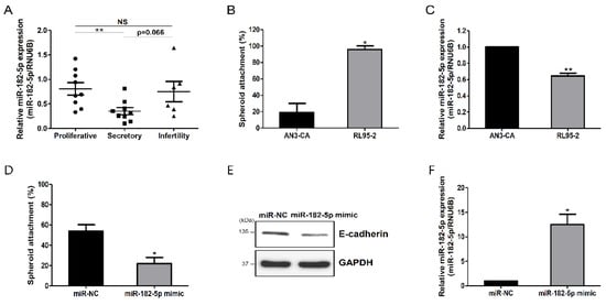 miR-182-5p inhibited the receptive ability of endometrial epithelial cells. (A) Analysis of miR-182-5p expression during the proliferative and secretory phases, and the infertile secretory phase of endometrial tissues. (B) Assessment of spheroid attachment to non-receptive AN3-CA cells or receptive RL95-2 cells. (C) Analysis of miR-182-5p expression in AN3-CA and RL95-2 cells. (D) Spheroid-attachment rate of RL95-2 cells transfected with an miR-182-5p mimic. (E) Effect of the miR-182-5p mimic on E-cadherin protein expression in RL95-2 cells. (F) Confirmation of miR-182-5p expression in RL95-2 cells transfected with the miR-182-5p mimic. The data shown represent the mean ± standard error of the mean (SEM) from three independent experiments (n = 3). * p < 0.05; ** p < 0.01; NS: not significant.