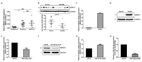 Most miRNAs induce phenotypic changes by regulating the expression levels of target genes through post-transcriptional mechanisms []. To identify target genes associated with endometrial receptivity, we analyzed seven databases including Cupid, MirAncesTar, miRDB, MiRNATIP, MultiMiTar, RNA22, and TargetScan using the microRNA Data Integration Portal (mirDIP; http://ophid.utoronto.ca/mirDIP/; 5 February 2021). NDRG1 was selected as a target gene for miR-182-5p. Moreover, we previously reported a correlation between miR-182 and NDRG1 in a competing-endogenous RNA network []. Therefore, to investigate the association between endometrial receptivity and NDRG1, we evaluated NDRG1 expression in the proliferative and secretory phase of the normal endometrium and in the secretory phase of infertility. The mRNA-expression level of NDRG1 was significantly elevated in the secretory phase of the endometrium, compared to that in the proliferative phase, but did not differ significantly between the secretory phases of normal and infertile endometrium tissues (Figure 2A). However, NDRG1 protein abundance was lower in infertile versus normal endometrium tissues, although the difference was not significant (Figure 2B). In addition, NDRG1 mRNA and protein were upregulated in RL95-2 cells, which are receptive endometrial cell lines (Figure 2C,D). These data demonstrate the potential of NDRG1 as a putative target of miR-182-5p for regulating endometrial receptivity. Transfecting synthetic miR-182-5p mimics downregulated NDRG1 expression at both the mRNA and protein levels (Figure 2E,F). Moreover, NDRG1 mRNA expression was significantly increased by miR-182 knockdown (Figure 2G,H). Therefore, these results strongly suggest that miR-182-5p-mediated NDRG1 downregulation was associated with defective endometrial receptivity.