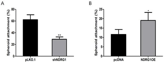 NDRG1 positively affected the attachment of JAr spheroids to endometrial epithelial cells. (A) Spheroid-attachment rate to NDRG1-depleted RL95-2 cells. (B) Spheroid-attachment rate to NDRG1-overexpressing AN3-CA cells. The data shown represent the mean ± SEM from three independent experiments (n = 3). * p < 0.05; ** p < 0.01.