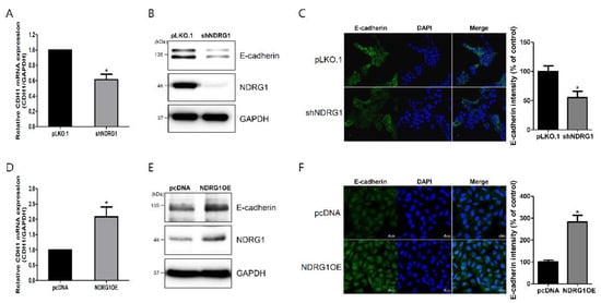 E-cadherin plays a critical role in endometrial receptivity, which is important for successful embryo implantation [,]. NDRG1 can upregulate E-cadherin expression in pancreatic cancer cells []. Therefore, to investigate the relationship between NDRG1 and E-cadherin, which were downregulated by miR-182-5p overexpression, we established an RL95-2 cell line with stably depleted NDRG1 expression using the short-hairpin RNA (shRNA)-mediated gene-silencing method. NDRG1 depletion markedly downregulated E-cadherin mRNA and protein expression (Figure 4A,B). We also established AN3-CA cells that overexpressed NDRG1. NDRG1 overexpression markedly upregulated E-cadherin mRNA and protein expression (Figure 4D,E). These data indicate that NDRG1 positively regulated E-cadherin expression in endometrial epithelial cells. To confirm that NDRG1 can regulate E-cadherin expression, we performed immunofluorescence staining with NDRG1-depleted or -overexpressing cells. E-cadherin expression was attenuated by NDRG1 depletion and enhanced by NDRG1 overexpression (Figure 4C,F). These results suggest that NDRG1 positively regulated E-cadherin expression, which is related to endometrial receptivity and is important for successful embryo implantation.
