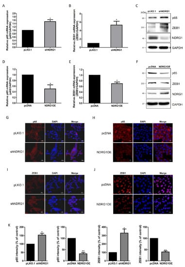 The NF-κΒ/ZEB1 pathway has been found to repress E-cadherin expression in cancer cell lines [,]. Therefore, to investigate the role of NDRG1 in the NF-κΒ/ZEB1 pathway, we analyzed the expression patterns of p65 and ZEB1 in NDRG1-depleted or -overexpressing cells. The mRNA-expression levels of p65 and ZEB1 were significantly elevated by NDRG1 depletion (Figure 5A,B). NDRG1 depletion also induced the protein expression of p65 and ZEB1, suggesting that NDRG1 may regulate endometrial receptivity through the NF-κΒ/ZEB1 pathway (Figure 5C). To test this hypothesis, we examined the expression levels of p65 and ZEB1 in AN3-CA cells overexpressing NDRG1. In contrast to NDRG1 depletion, both p65 and ZEB1 mRNA levels were downregulated by NDRG1 overexpression (Figure 5D,E). NDRG1 overexpression also reduced the protein-expression levels of p65 and ZEB1 (Figure 5F). In addition, the immunofluorescence-staining results agreed with the Western blotting results (Figure 5G–K). These findings suggest that NDRG1 may upregulate E-cadherin expression by downregulating the NF-κΒ/ZEB1 pathway in endometrial epithelial cells.